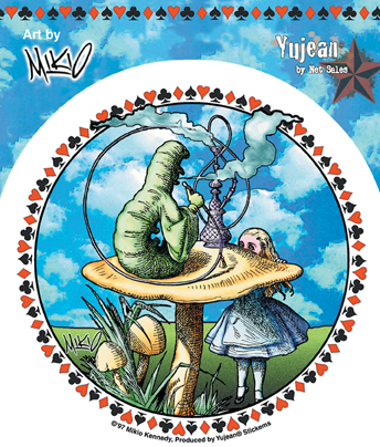A ring of spades, hearts, clubs, and diamonds surround the curious hookah-smoking caterpillar and his inquisitor! Weather-resistant, extra long-lasting die-cut decal.